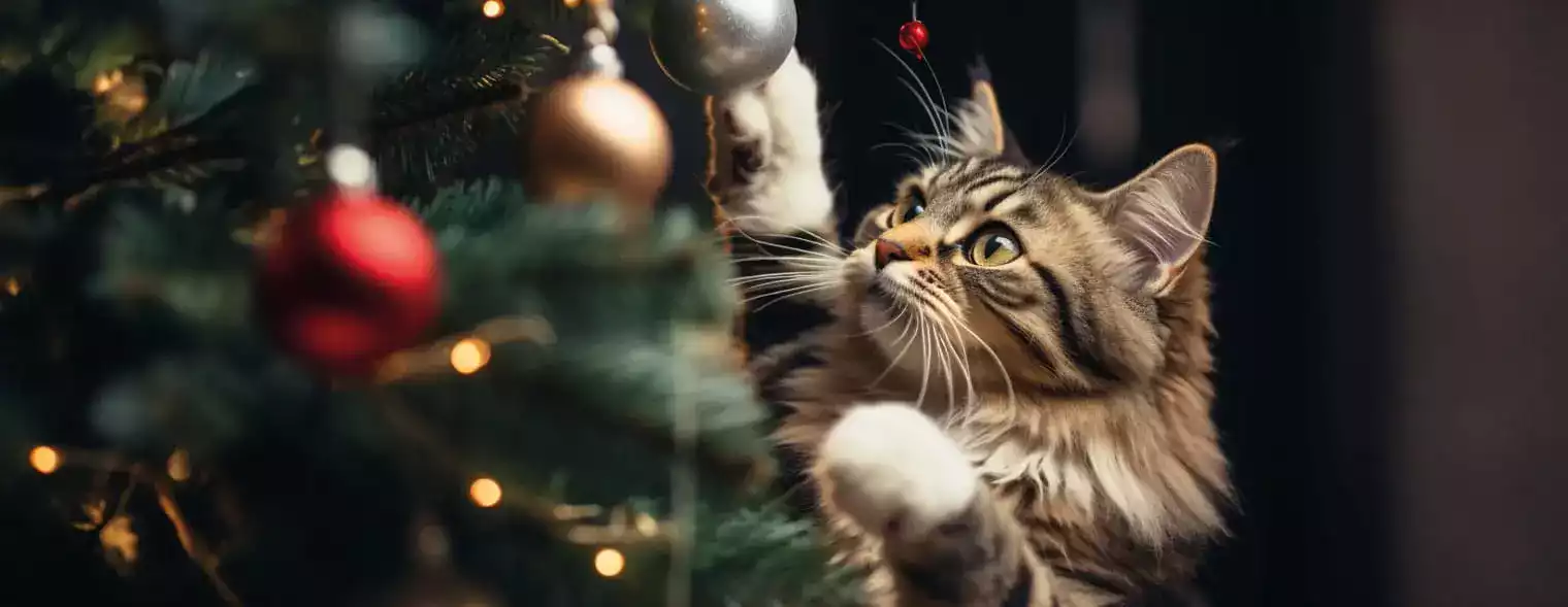 évite les guirlandes, les rubans et les ornements fragiles qui pourraient être avalés par ton félin ou le blesser. Et attache solidement le sapin de Noël pour éviter qu'il ne tombe en cas de tentative d'escalade !