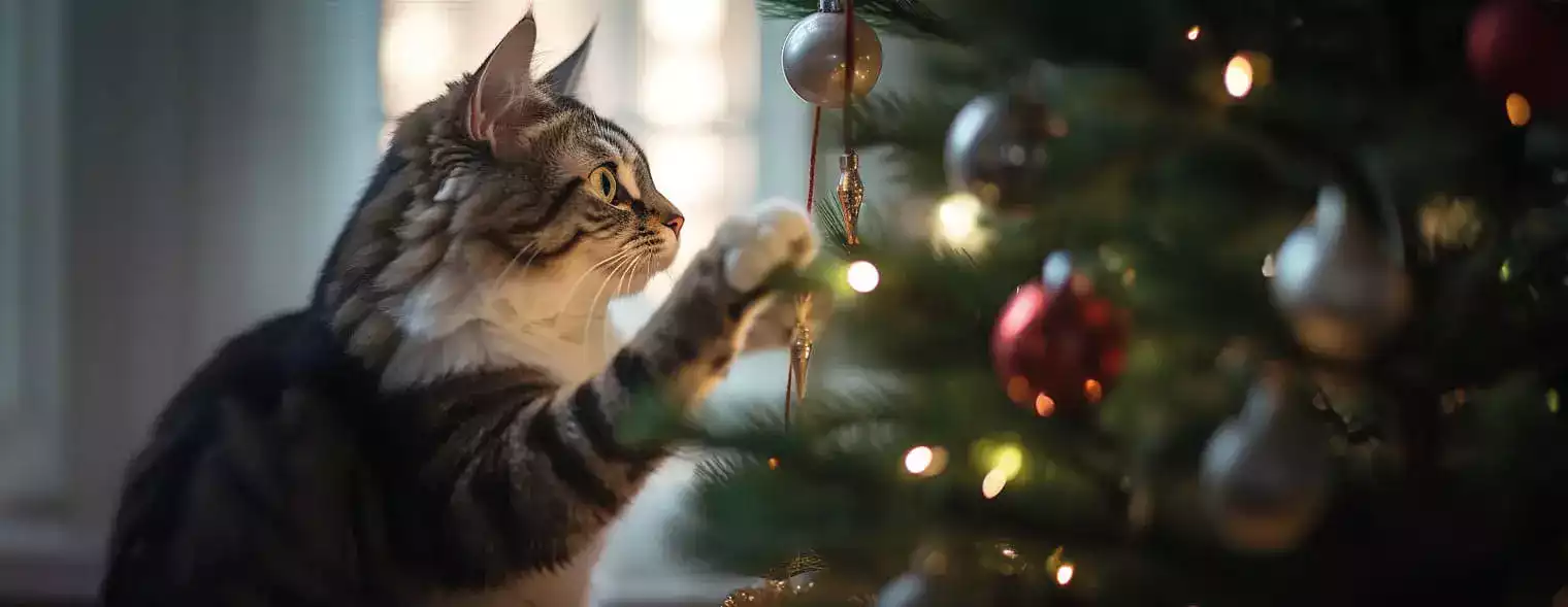 évite les guirlandes, les rubans et les ornements fragiles qui pourraient être avalés par ton félin ou le blesser. Et attache solidement le sapin de Noël pour éviter qu'il ne tombe en cas de tentative d'escalade !