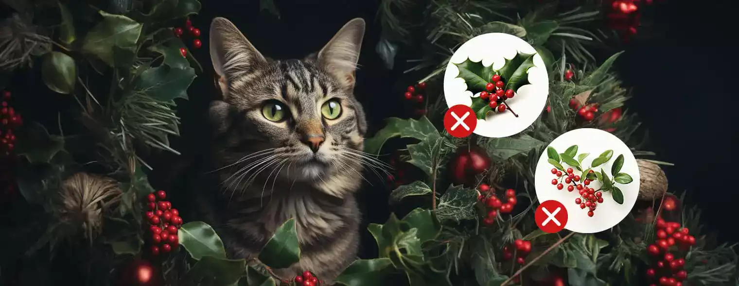 de nombreuses plantes courantes dans cette période, comme le houx et le gui, sont toxiques pour les chats. Assure-toi qu'elles sont hors de leur portée.